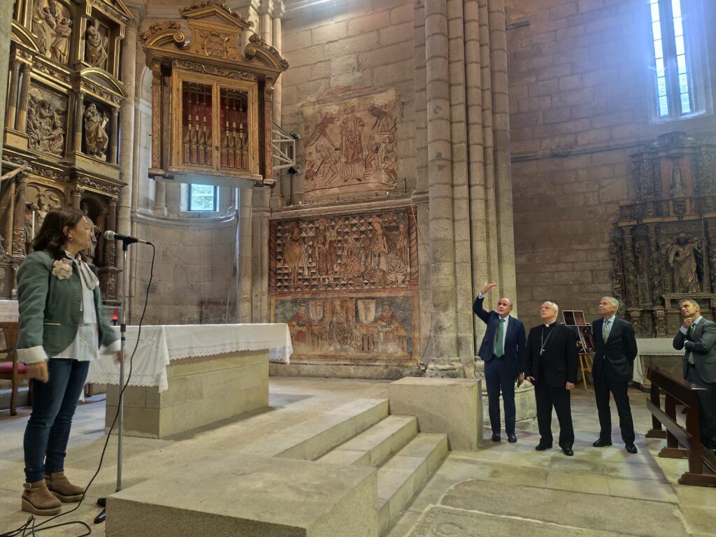Esto últimos comenzaron explicando los trabajos realizados, con el fin de que los relicarios pudiesen convivir las dos obras descubiertas: se buscó un sistema de brazo móvil, que ha sido posible gracias a la financiación de la Fundación Iberdrola, con el que éstos se pueden deslizar hacia un lado y así poder disfrutar del ciclo de pintura mural de los laterales de la cabecera de la iglesia. Este sistema se realizó también en la catedral de Salamanca y ese mismo equipo, formado por el ingeniero D. Alfredo Díaz de la empresa EtisRoc, y el arquitecto D. Fernando de Bonrostro, diseñó estos dos mecanismos. Los relicarios, restaurados por el Centro de Restauración San Martín, con la financiación de la parroquia y de Paradores, son del año 1595, obra de D. Juan de Angés al igual que el retablo mayor. Las pinturas murales descubiertas, del siglo XV y XVI, fueron restauradas también por el Centro de Restauración San Martín, con la financiación de la Diócesis de Ourense.