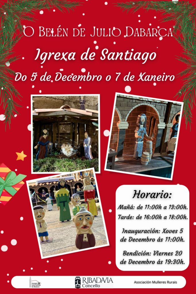 diciembre para exponer el Belén de Julio Dabarca. Su autor, natural de Francelos, procede de una familia de tallistas que comenzaron en la talla de ataúdes, sector próspero en esta comarca hace unas décadas. En torno al 2001, Julio Dabarca comenzaba a tallar estas figuras en madera de cerezo, para crear un Nacimiento con escenas propias y típicas de la vida de Ribadavia y de todo el Ribeiro.